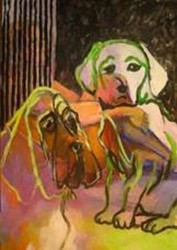 schilderijen - collages - hond - uil - kat - muis - kip - naakt - model - portret - kleurrijk - realistisch - impressionistisch - vrij - ogen - textiel - papier